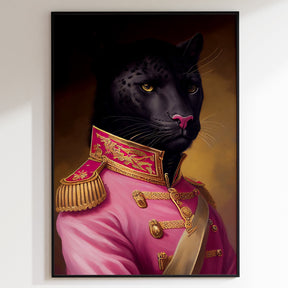 Introducing our Black Panther art print, dressed in a bold pink military uniform, contrasted with a muted background! The print is a playful and edgy statement piece that is sure to add a touch of rebellious charm to any room.
