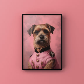 Presenting Ian The Border Terrier from our 'Pup Parade' collection. He is dressed in a dashing pink military uniform. The striking design of Ian is well complemented by a muted pink background. His captivating expression adds a touch of elegance and sophistication to any interior decor, making him a marvellous accent piece.